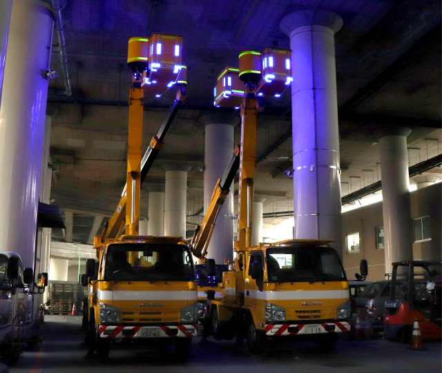 高所作業車のバケットに取付ける事で視認性を向上させ、より安全な作業に結びつけます。