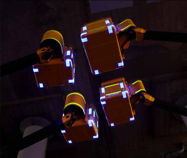 高所作業車のバケットであれば、底面にL型4枚、側面にI型8枚でセットアップ完了。充分な光量で注意喚起を促すことができます。