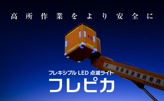 また、高所作業車の視認性に着目したフレキシブルLED点滅ライト「フレピカ」の商品紹介ページを用意しました。