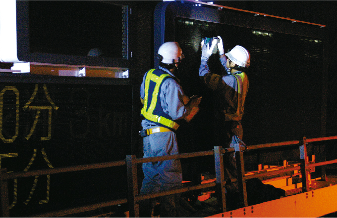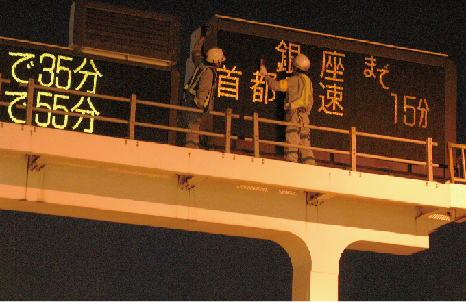 電気技術と情報技術の融合によって、首都高速道路をご利用のお客様に対して、より早く、より分りやすい交通状況の提供を可能にしています。図形情報板、文字情報板、ITS設備等の交通通信設備や様々な設備間の情報交換を可能とする通信ネットワーク設備の点検・補修を行っています。